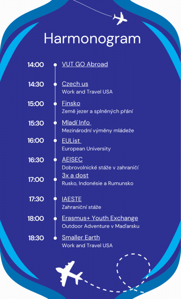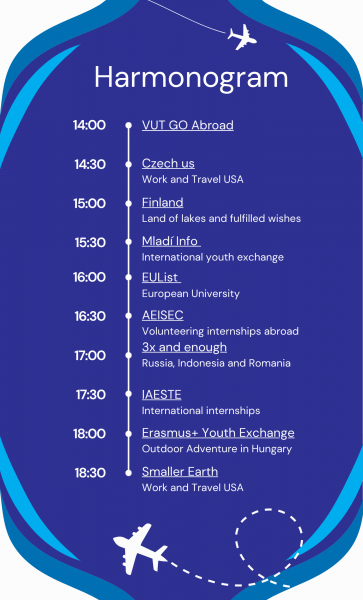 This event is all about showcasing a wide range of international opportunities for students and young people. Throughout the afternoon, students can explore various programs including study exchanges, volunteering internships, work and travel experiences, and European educational initiatives. Representatives from organizations such as Czech us, Smaller Earth, Erasmus+, AEISEC, IAESTE, and others will present how you can study, work, or volunteer abroad by international and local students.